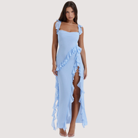 • Fit: Fitted at the bust and hips, with a slit and cascading ruffles.